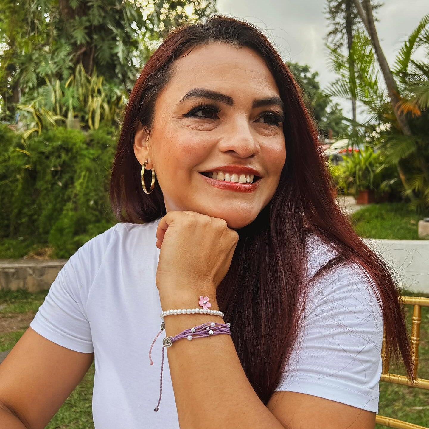 La pulsera Hearts and Pearls es una mezcla perfecta entre ternura y sofisticación. Diseñada con múltiples hilos en tono lila, adornados con pequeños corazones plateados y delicadas perlas que brillan con cada movimiento.