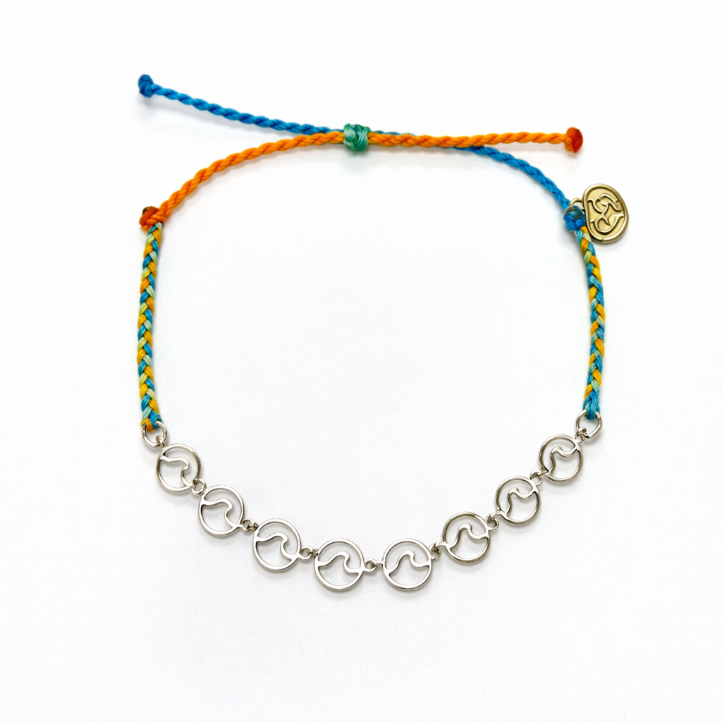 🌈 Su combinación de hilos en tonos azul y naranja refleja el contraste entre el océano y los atardeceres cálidos, mientras que su diseño central de eslabones ondulados evoca el vaivén de las olas.
